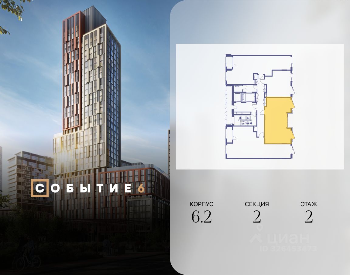 Продаётся 2-комнатная квартира от застройщика: общая площадь 59.80 м², жилая 30.10 м², кухня 18.40 м², 2-й этаж, жилой квартал ''Событие-6'', корпус 2 (секция 2) Срок сдачи: 1 квартал 2029 года.