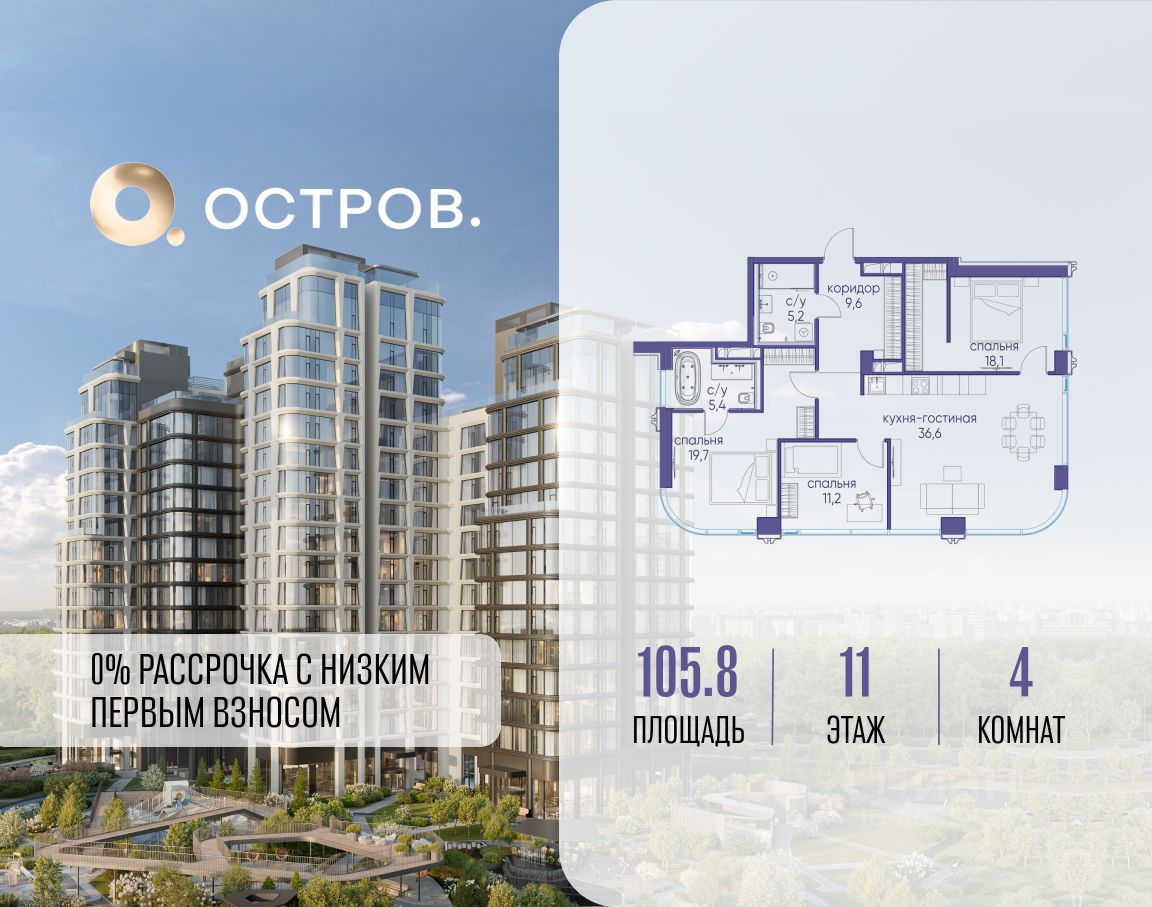 Продаётся 4-комн. квартира от застройщика: общая площадь 105.80 м², жилая 49.00 м², кухня 36.60 м², 11-й этаж, жилой квартал ''Остров 12'', корпус 1 (секция 3). Срок сдачи: 1 квартал 2029 года. 2 совмещенных санузла. В жилой зоне 2 больших окна на одну сторону, хорошая инсоляция.