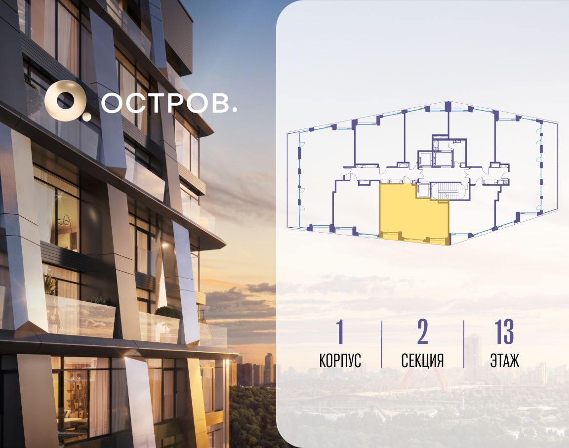 ОСТРОВ.12.1 - часть жилого комплекса на западе Москвы, в 15 минутах езды от центра. Это настоящий заповедник посреди большого города, в окружении реки и 650 га заповедников. Здесь все необходимое находится по соседству: от детского сада до супермаркета, от фитнес-зала до серфинг-центра. На территории созданы все условия для отдыха и общения: клубная инфраструктура в домах и дворы-парки, набережные и променады, маршруты для спортсменов, детей и возрастных жителей. В нескольких минутах ходьбы расположена станция метро ''Мнёвники'' БКЛ. На автомобиле - 10 минут до Москва-Сити и 15 минут до Садового кольца.