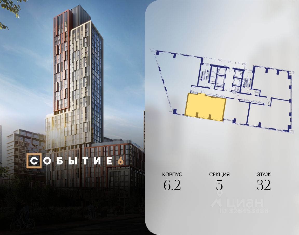 Продаётся 2-комнатная квартира от застройщика: общая площадь 61.80 м², жилая 32.90 м², кухня 17.80 м², 32-й этаж, жилой квартал ''Событие-6'', корпус 2 (секция 5) Срок сдачи: 1 квартал 2029 года.