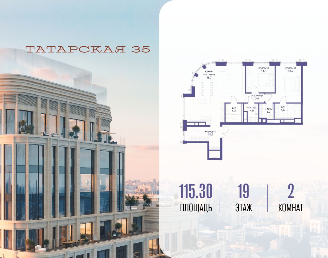ТАТАРСКАЯ, 35 - новая архитектурная доминанта Замоскворечья, достопримечательность на фотопанорамах исторического центра Москвы. Элитный дом, созданный для тех, кто умеет смотреть далеко вперед, мыслить масштабно и воплощать собственный сценарий жизни.