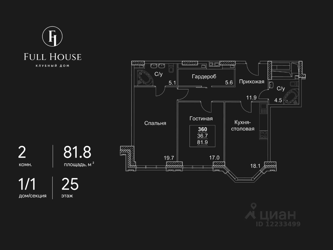 Продается 2-комнатная квартира в ЖК Full House на 25 этаже. Общая площадь квартиры составляет 81,8 кв.м. Квартира без отделки. Жилой комплекс сдан!