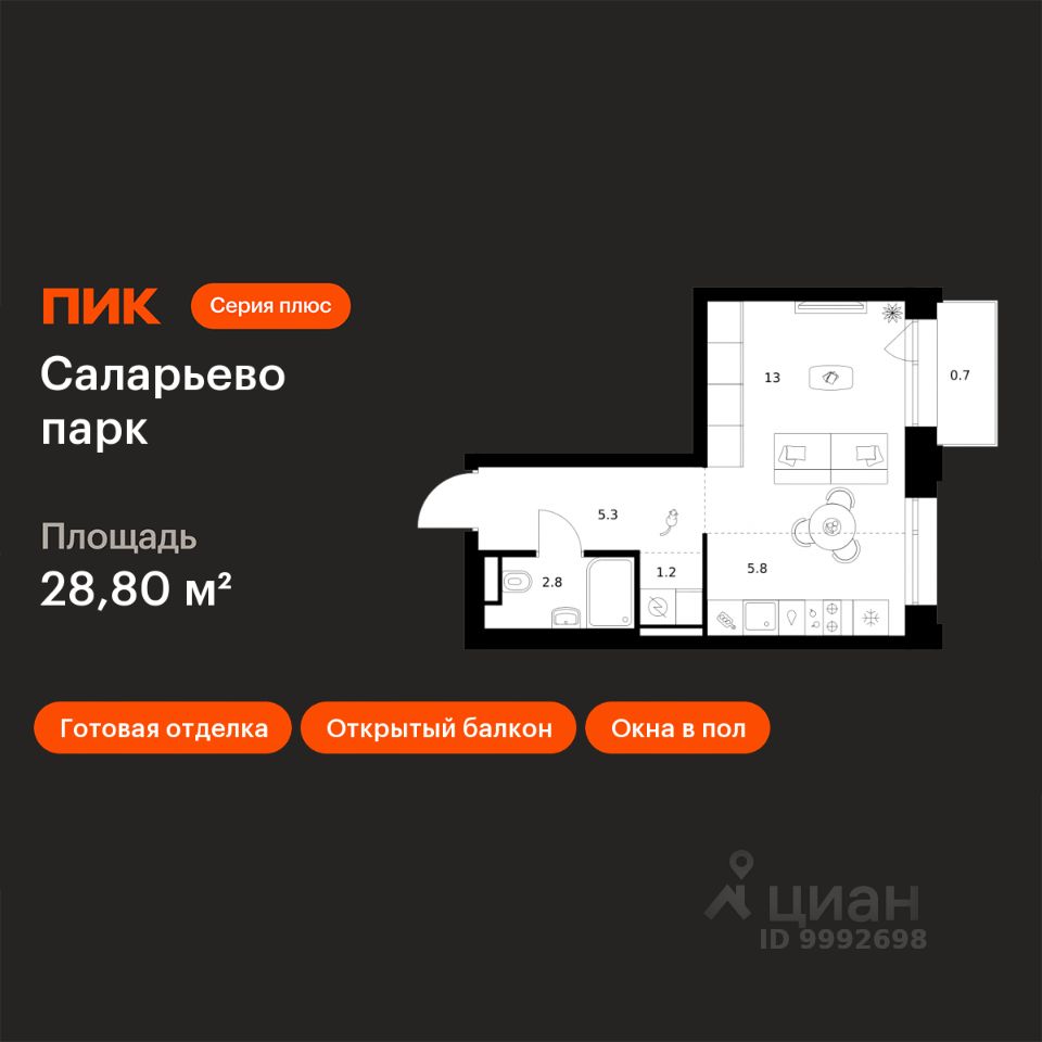 Продаётся квартира-студия площадью 28,8 кв.м на 7 этаже 24 этажного дома (Корпус 82.8, Секция 8) проекта ПИК Саларьево парк. Светлый просторный подъезд на уровне земли, функциональная планировка, большие окна, c отделкой.