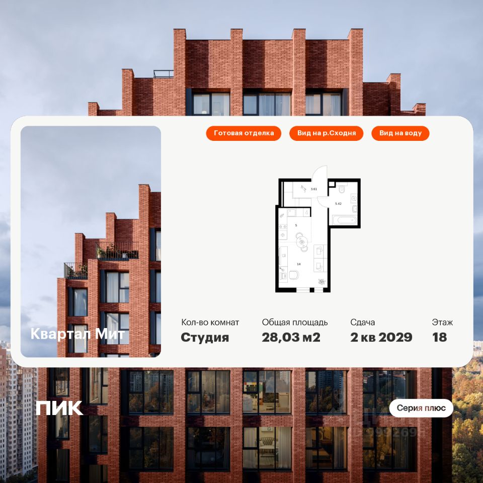 Новостройка! Продается 1-комн. кв-ра площадью 28,03 кв.м, (Корпус 3.4, Секция 4) 14 этаж 32-этажного дома в Квартал Мит от ПИК. ''Квартал Мит'' строится в экологически чистом районе Митино, где по соседству расположен большой лесопарк, а с двух сторон протекают реки Сходня и Журавка. Для семей с детьми здесь появится школа и два детских сада. В 20 минутах пешком находится станция метро ''Пятницкое шоссе'', а за 10 минут на автомобиле можно доехать до МКАД.