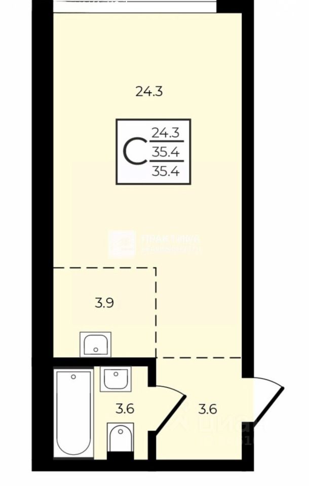 ОБЩАЯ ИНФОРМАЙИЯ Общая площадь квартиры — 35,4 кв. м, жилая — 24,3 кв. м. Так же есть кухня площадью 4 кв. м. В квартире один совмещённый санузел. Квартира без отделки, что даёт возможность новому владельцу воплотить свои дизайнерские идеи.