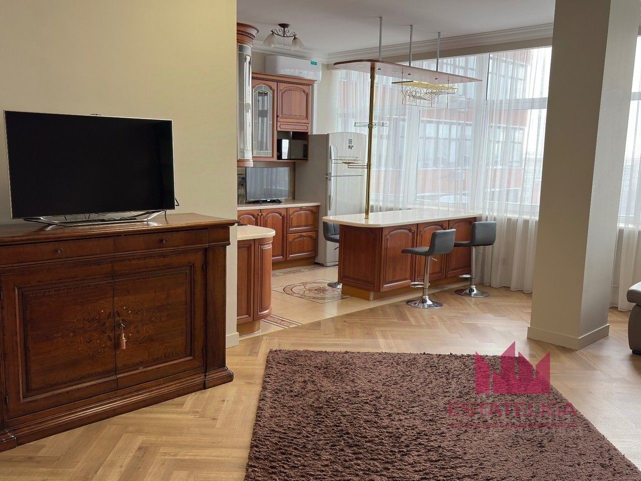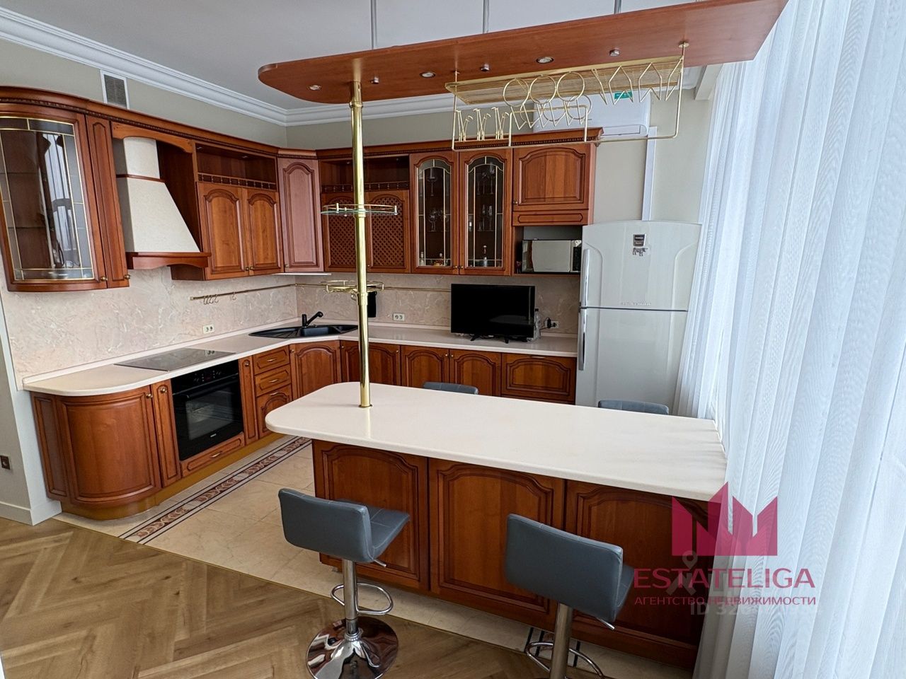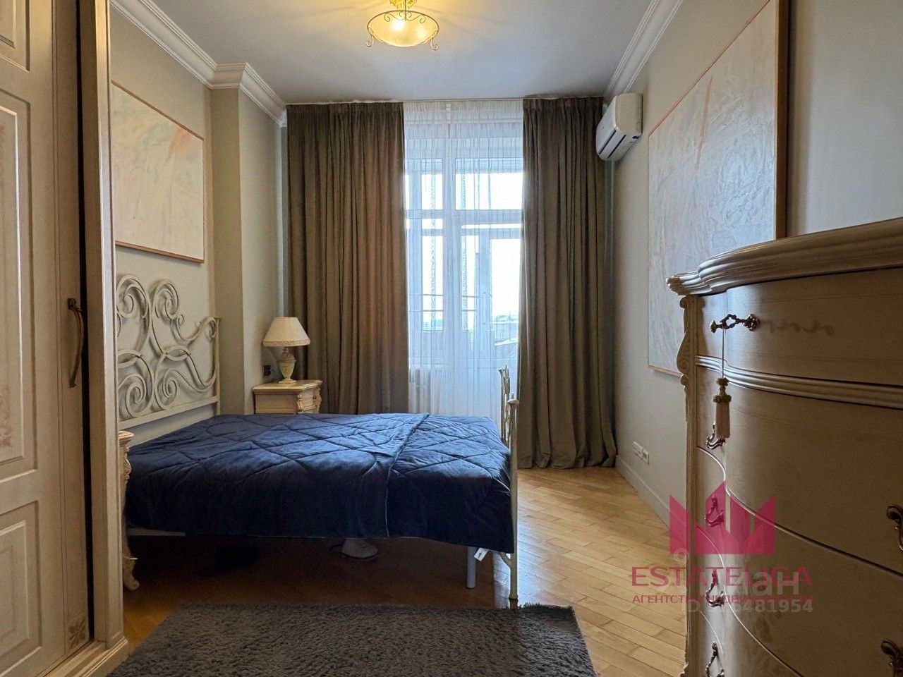 Выполнен авторский дизайнерский ремонт с использованием качественных материалов. В квартире — итальянская резная мебель, встроенная техника, система кондиционирования.