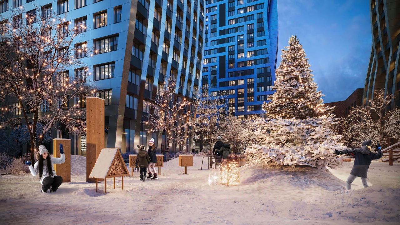 Благоустройство: Внутренний двор комплекса разработан совместно с бюро GAFA. Основная идея - создать аналог Центрального парка в Нью-Йорке, гармонично сочетая высотные здания и большое изолированное парковое пространство. Вся площадь двора-парка будет огорожена и составит более 2 га, из которых 45% - озеленение. Одним из самых важных ландшафтных элементов здесь станет небольшая речка, наполняющаяся во время дождя. Вокруг неё появится сеть из островов, внутри которых расположатся тематические зоны спорта и отдыха.