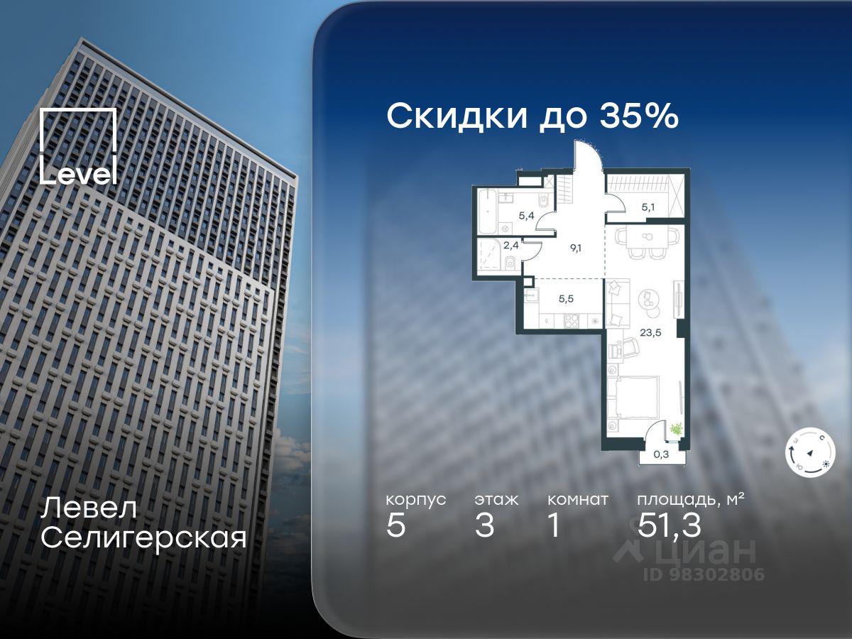 В жилом квартале, расположенном в южной части района Западное Дегунино, продаётся 1-комнатная квартира площадью 51.30 кв.м без отделки. Квартира расположена на 3 этаже 40-этажного корпуса 5 в жилом комплексе комфорт-класса Левел Селигерская (компания Level Group/Левел групп).