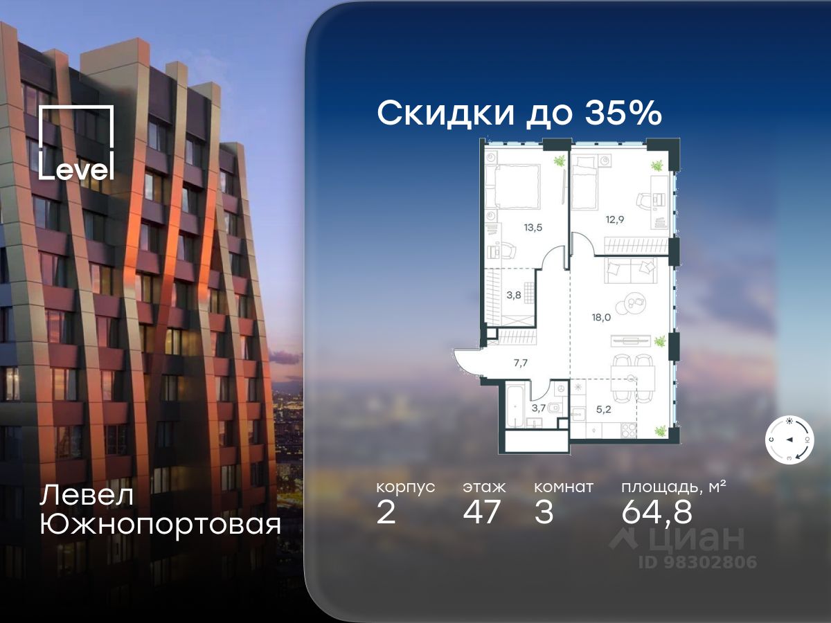 В северной части района Печатники продается 3-комнатная квартира площадью 64.80 кв.м без отделки. Квартира расположена на 47 этаже 47-этажного корпуса 2 в жилом комплексе комфорт-класса Левел Южнопортовая (компания Level Group/Левел групп).