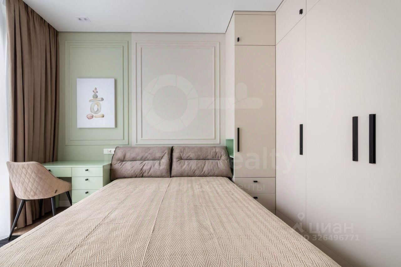 ID 8063. Квартира с дизайнерским ремонтом, мебелью и техникой в премиальном ЖК ''Dialog''. Высокие потолки - 3.25 м., спальня - 12.5 кв.м., кухня-гостиная - 17.5 кв.м., зонально - 8.1/9.7 кв.м. Квартира оборудована гардеробной комнатой. Окна обращены в сторону двора, направление юго-восток. Оснащение техникой: кондиционеры, стиральная машина, посудомоечная машина, духовая микроволновая печь, холодильник, ТВ в каждой комнате. В квартире много света. Панорамные окна в пол обеспечивают достаточную освещённость в дневное время. Внутреннее освещение квартиры состоит из ярких потолочных галогеновых светильников и контурно периферического освещения, а также настенного и кухонного освещения. На первом этаже красивая входная группа. За порядком следит консьерж.