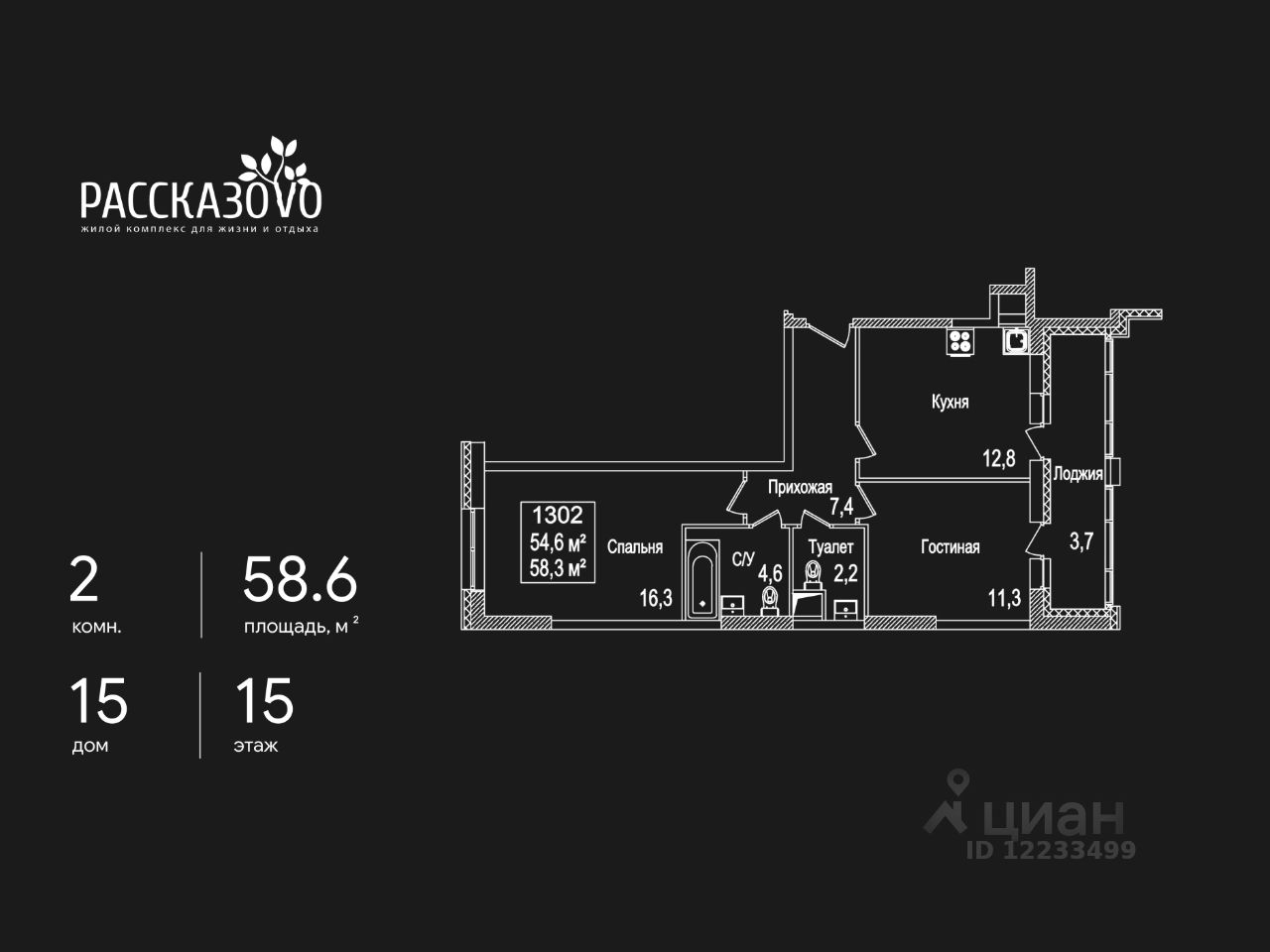 Продается 2-комнатная квартира в ЖК Рассказово на 15 этаже. Общая площадь квартиры составляет 58,6 кв.м. Квартира без отделки.