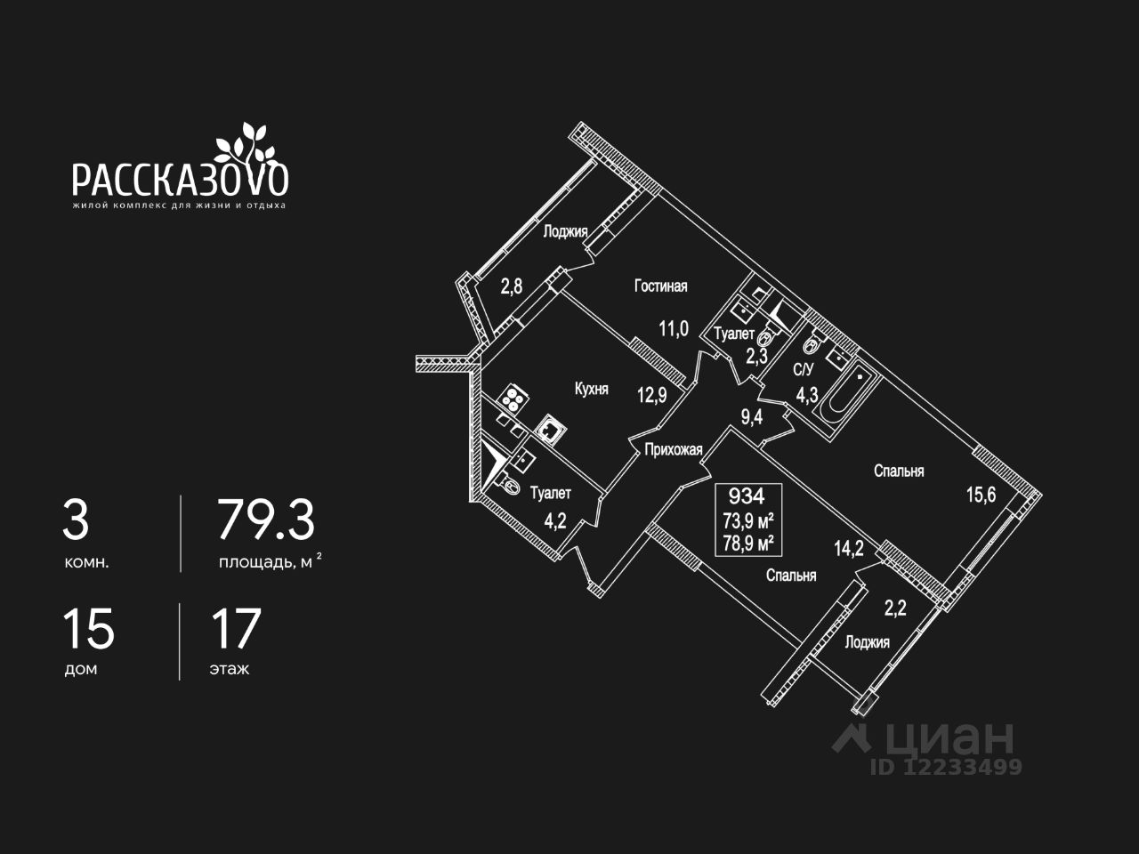 Продается 3-комнатная квартира в ЖК Рассказово на 17 этаже. Общая площадь квартиры составляет 79,3 кв.м. Квартира без отделки.