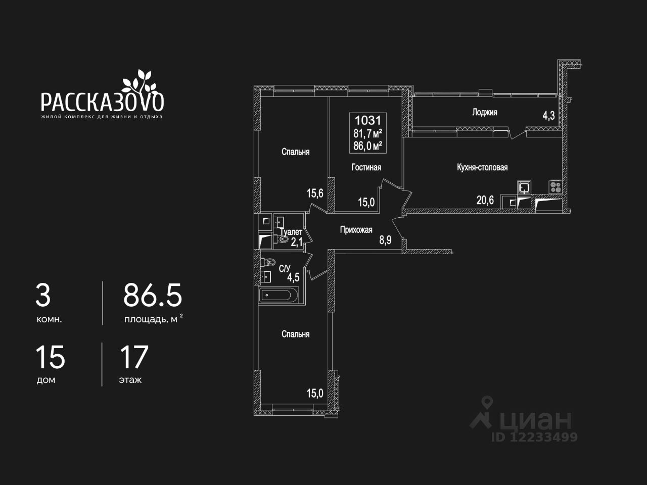 Продается 3-комнатная квартира в ЖК Рассказово на 17 этаже. Общая площадь квартиры составляет 86,5 кв.м. Квартира без отделки.