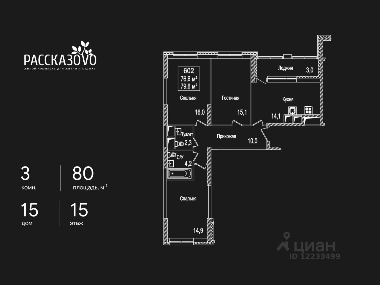 Продается 3-комнатная квартира в ЖК Рассказово на 15 этаже. Общая площадь квартиры составляет 80 кв.м. Квартира без отделки.