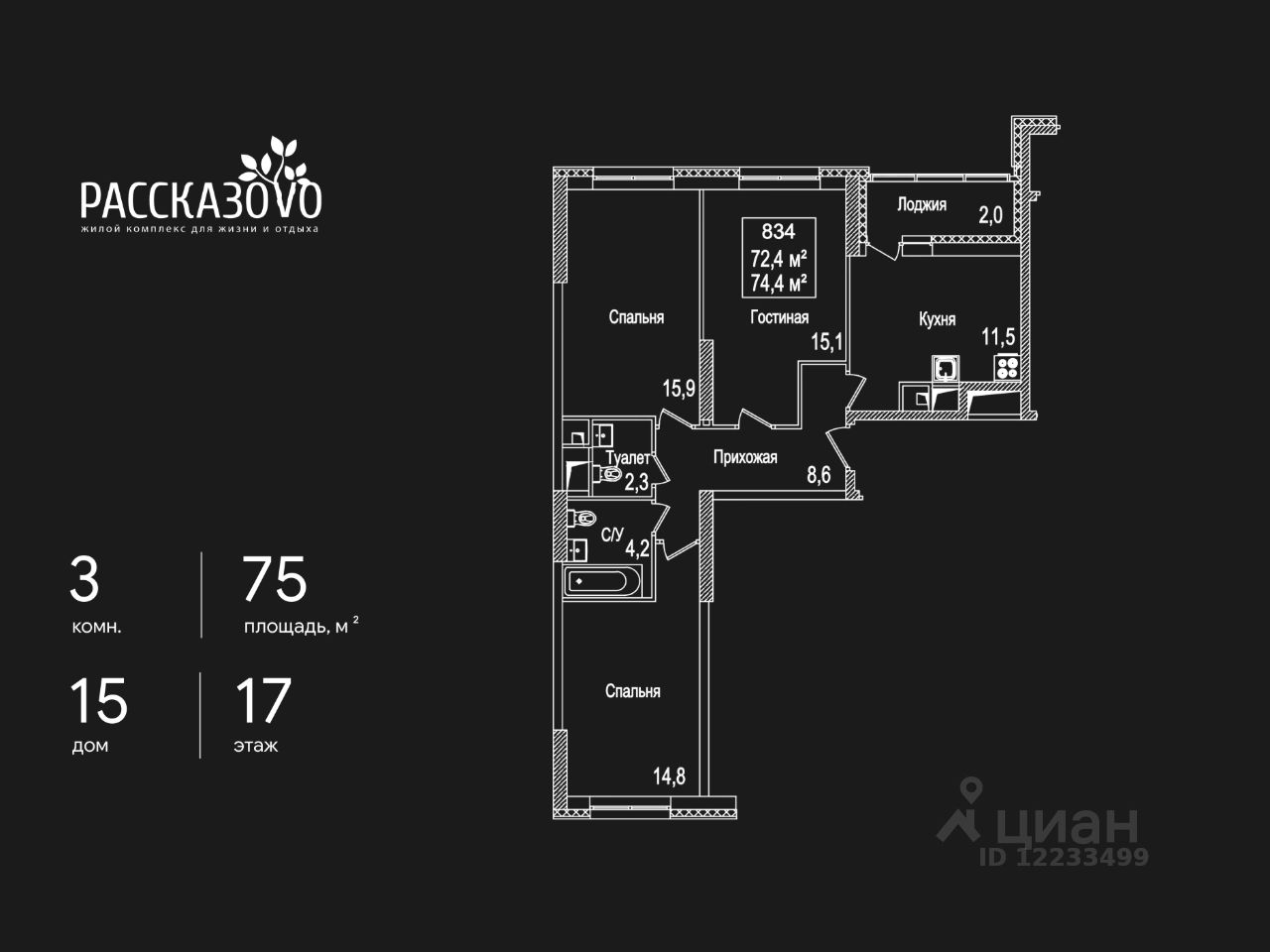 Продается 3-комнатная квартира в ЖК Рассказово на 17 этаже. Общая площадь квартиры составляет 75 кв.м. Квартира без отделки.