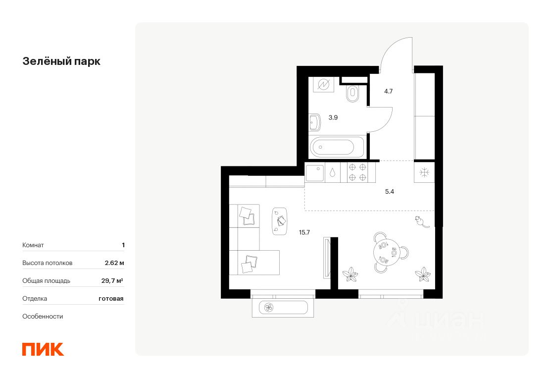 Продаётся квартира-студия площадью 29,7 кв.м на 12 этаже 21 этажного дома (Корпус 5.2, Секция 1) проекта ПИК Зелёный парк. Светлый просторный подъезд на уровне земли, функциональная планировка, большие окна, c отделкой.