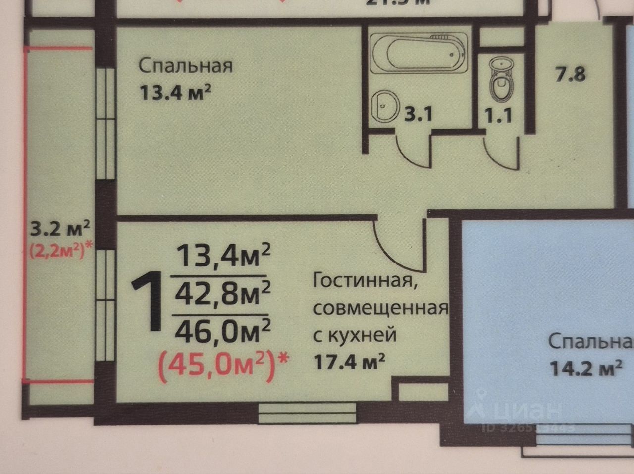 Информация по квартире: - 4 собственника (2 несовершеннолетних), - 3 этаж 3-го монолитного дома, - общая площадь 42,8 м², - жилая площадь 13,4 м², - площадь кухни 17,4 м², - ремонт, - 1 с/у (раздельный),