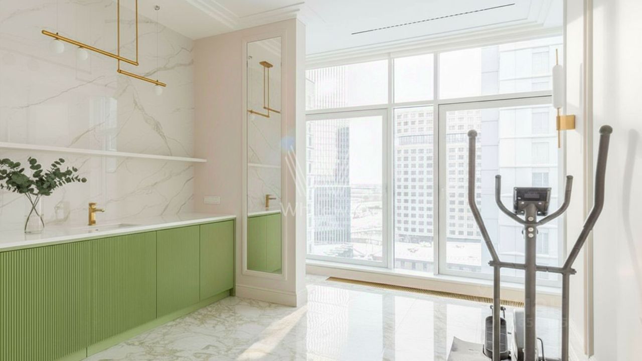 На 1 уровне спланирована кухня-гостиная, мастер-спальня со своей ванной комнатой, детский блок из двух спален с игровой комнатой и детской ванной комнатой, гостевая спальня со своим санузлом. На 2 уровне обустроен кабинет с кухней и кинотеатром, гостевая комната с санузлом, фитнес-зал, 3 большие гардеробные, 2 санузла, кладовая. Установлены холодильники Liebherr, телевизоры Samsung, в кинотеатре звуковая аппаратура Marshal. В наличии 2 машино-места.