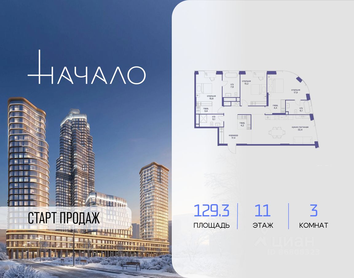 В престижном районе Пресня, на перекрестке делового и исторического центров Москвы, продается трехкомнатная квартира площадью 129.30 кв. м без отделки. Квартира находится на 11 этаже 24-этажного дома, в новом элитном жилом комплексе ''Начало'' от девелопера ''Донстрой''. Реализация проекта запланирована на 1 квартал 2030 года.