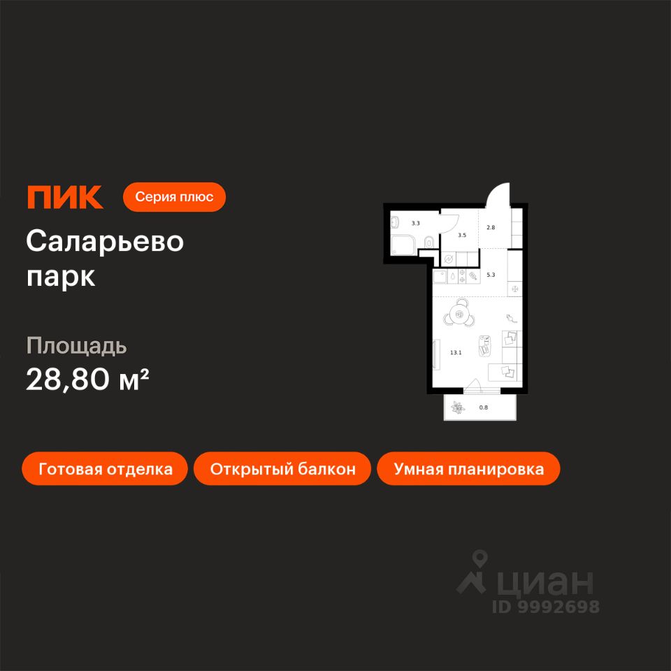 Продаётся квартира-студия площадью 28,8 кв.м на 5 этаже 24 этажного дома (Корпус 82.7, Секция 7) проекта ПИК Саларьево парк. Светлый просторный подъезд на уровне земли, функциональная планировка, большие окна, c отделкой.