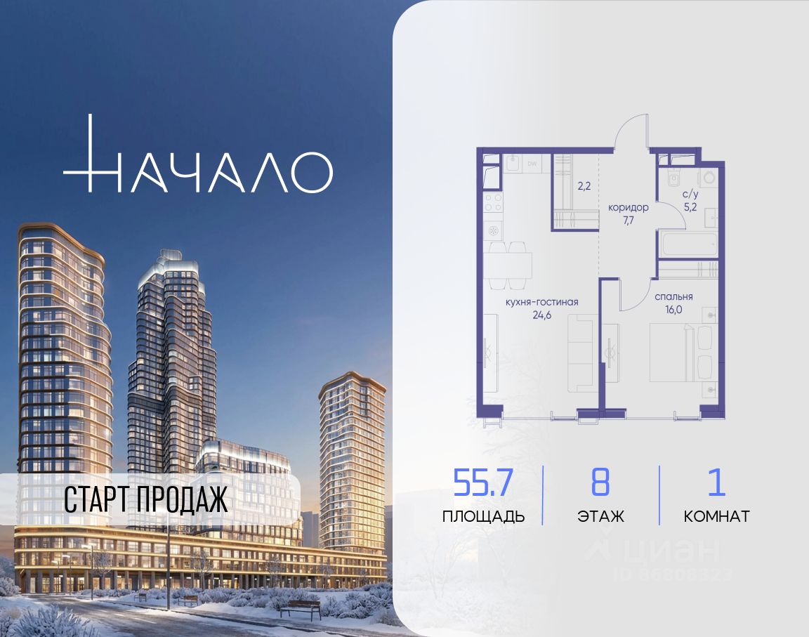 В престижном районе Пресня, на перекрестке делового и исторического центров Москвы, продается однокомнатная квартира площадью 55.70 кв. м без отделки. Квартира находится на 8 этаже 11-этажного дома, в новом элитном жилом комплексе ''Начало'' от девелопера ''Донстрой''. Реализация проекта запланирована на 1 квартал 2030 года.