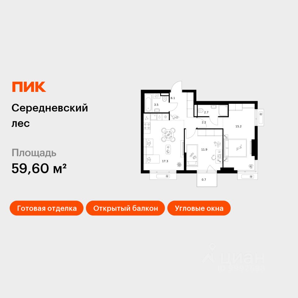 Продаётся 2-комн. квартира площадью 59,6 кв.м на 8 этаже 16 этажного дома (Корпус 2.1.5, Секция 5) проекта ПИК Середневский лес. Светлый просторный подъезд на уровне земли, функциональная планировка, большие окна, c отделкой.