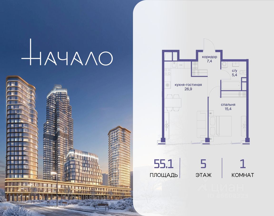 В престижном районе Пресня, на перекрестке делового и исторического центров Москвы, продается однокомнатная квартира площадью 55.10 кв. м без отделки. Квартира находится на 5 этаже 11-этажного дома, в новом элитном жилом комплексе ''Начало'' от девелопера ''Донстрой''. Реализация проекта запланирована на 1 квартал 2030 года.