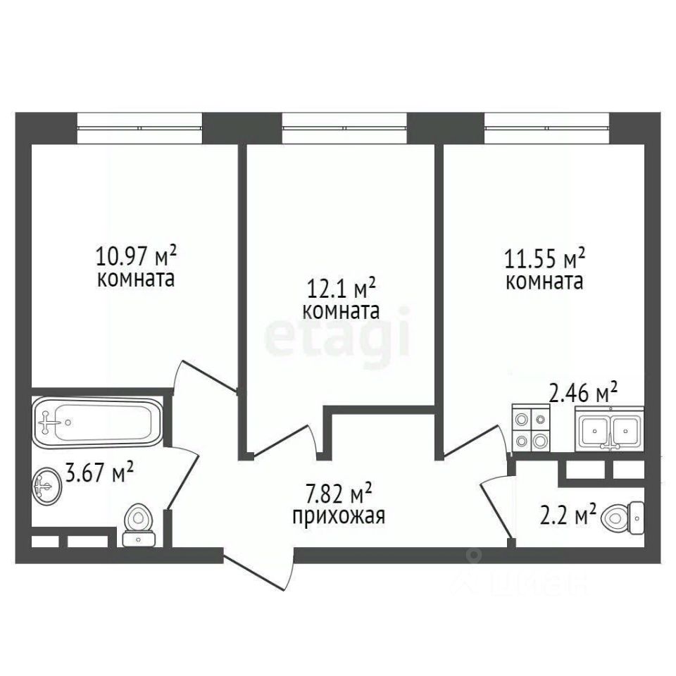 Планировка - Кухня-гостиная: 14,5 кв.м - Две спальни - Прихожая: 7,8 кв.м - Два отдельных санузла - Три окна с видом на улицу