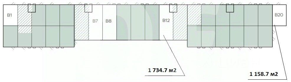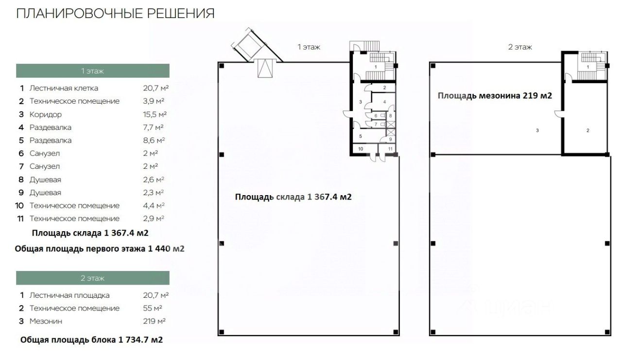 Общая площадь: 5 793.5 кв. м (5 блоков) Склад: 3 957 кв. м Офис: 741.5 кв. м Мезонин: 1 095 кв. м