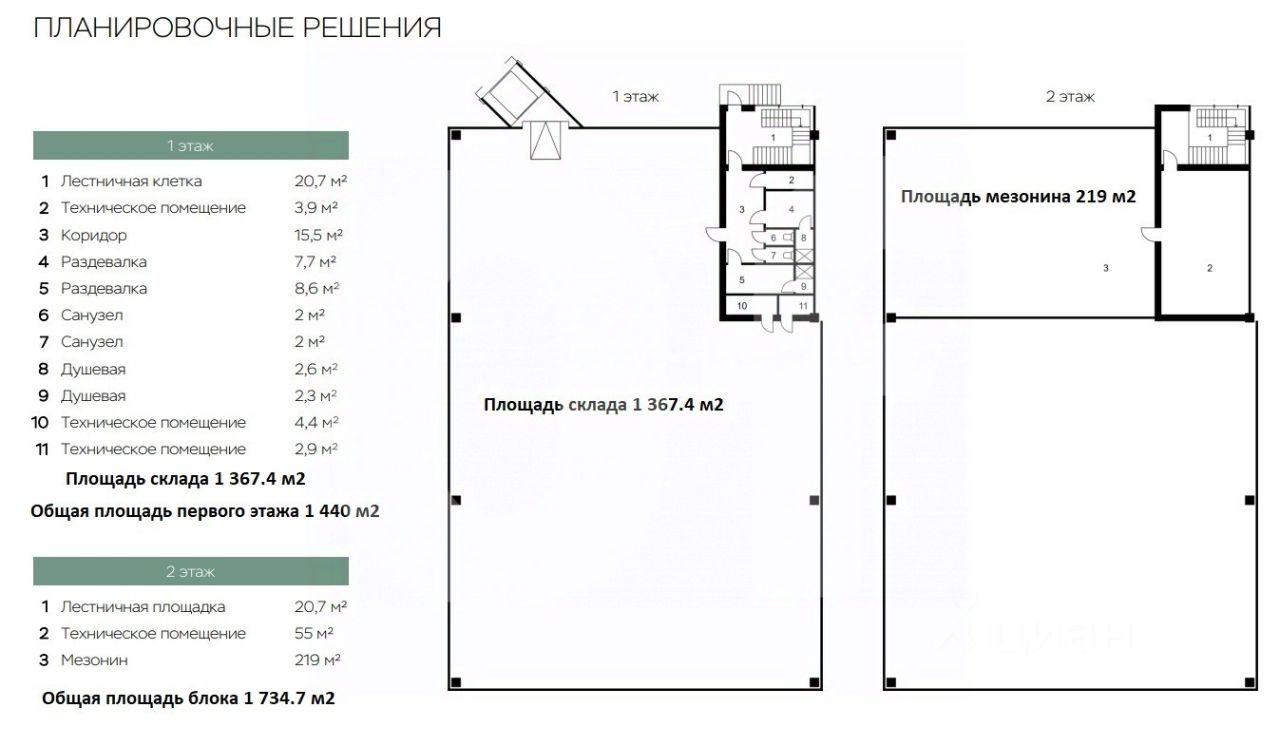 Общая площадь: 1 158.7 кв. м Склад: 791.4 кв. м Офис: 148.3 кв. м Мезонин: 219 кв. м