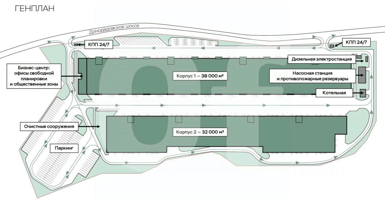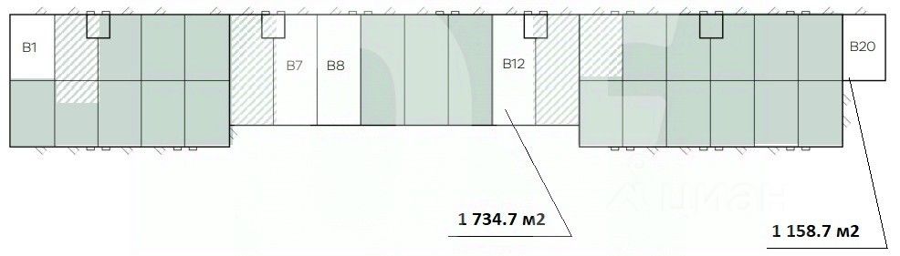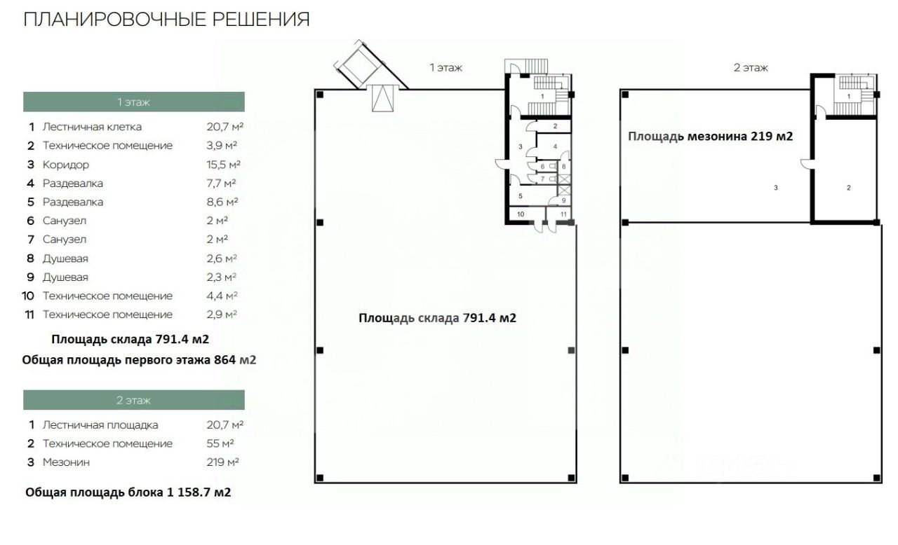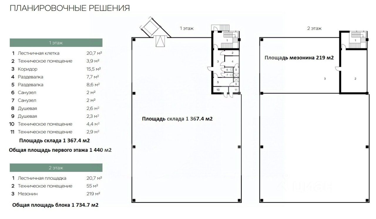 Общая площадь: 2 317.4 кв. м (2 блока) Склад: 1 582.8 кв. м Офис: 296.6 кв. м Мезонин: 438 кв. м
