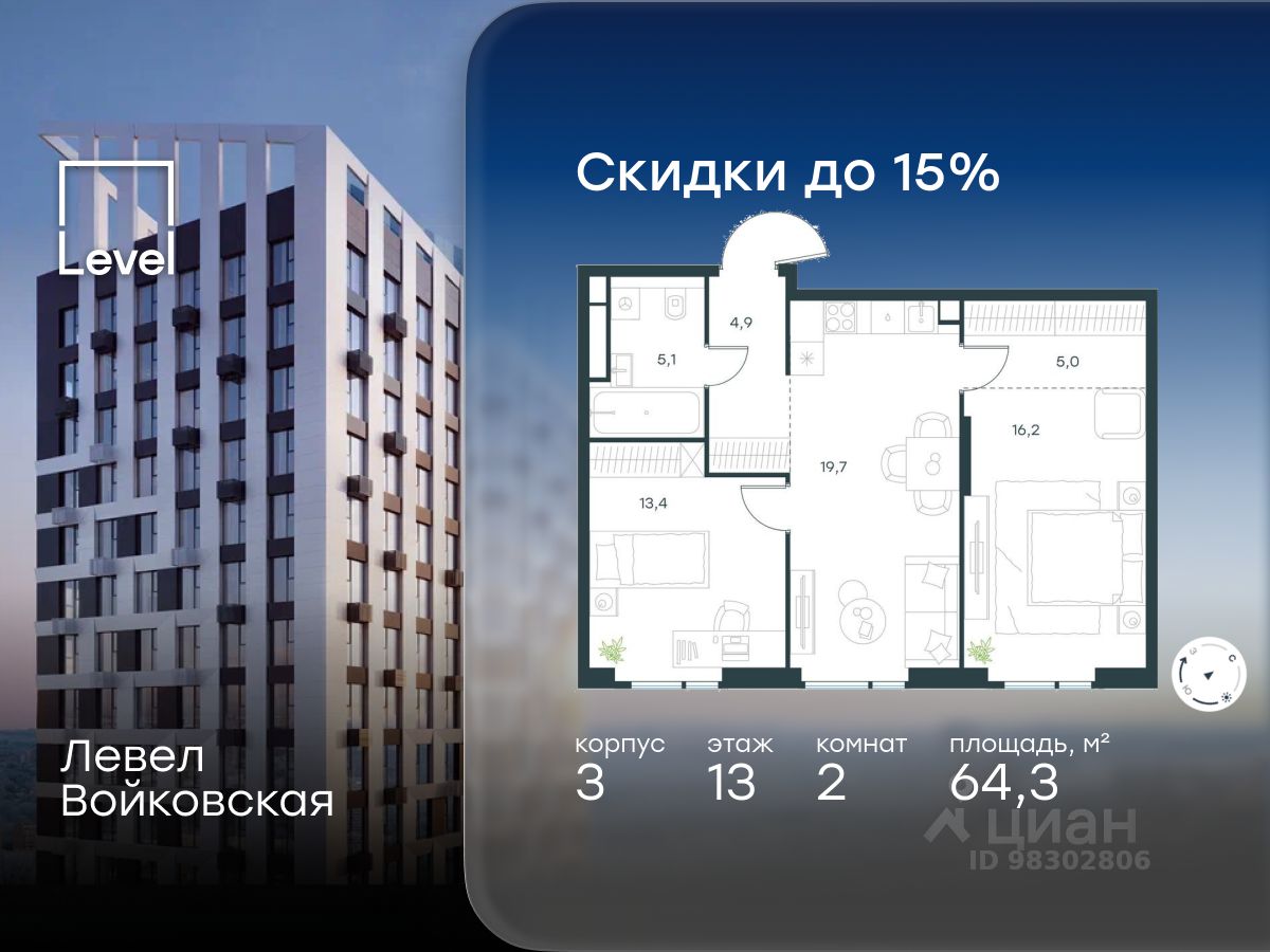 Продается 2-комнатная квартира площадью 64.30 кв. м без отделки. Квартира находится на 13 этаже 20-этажного корпуса 3, в новом жилом комплексе бизнес-класса Левел Войковская, расположенном рядом с живописным заповедником ''Покровское-Стрешнево'' (застройщик - компания Level Group/Левел групп).