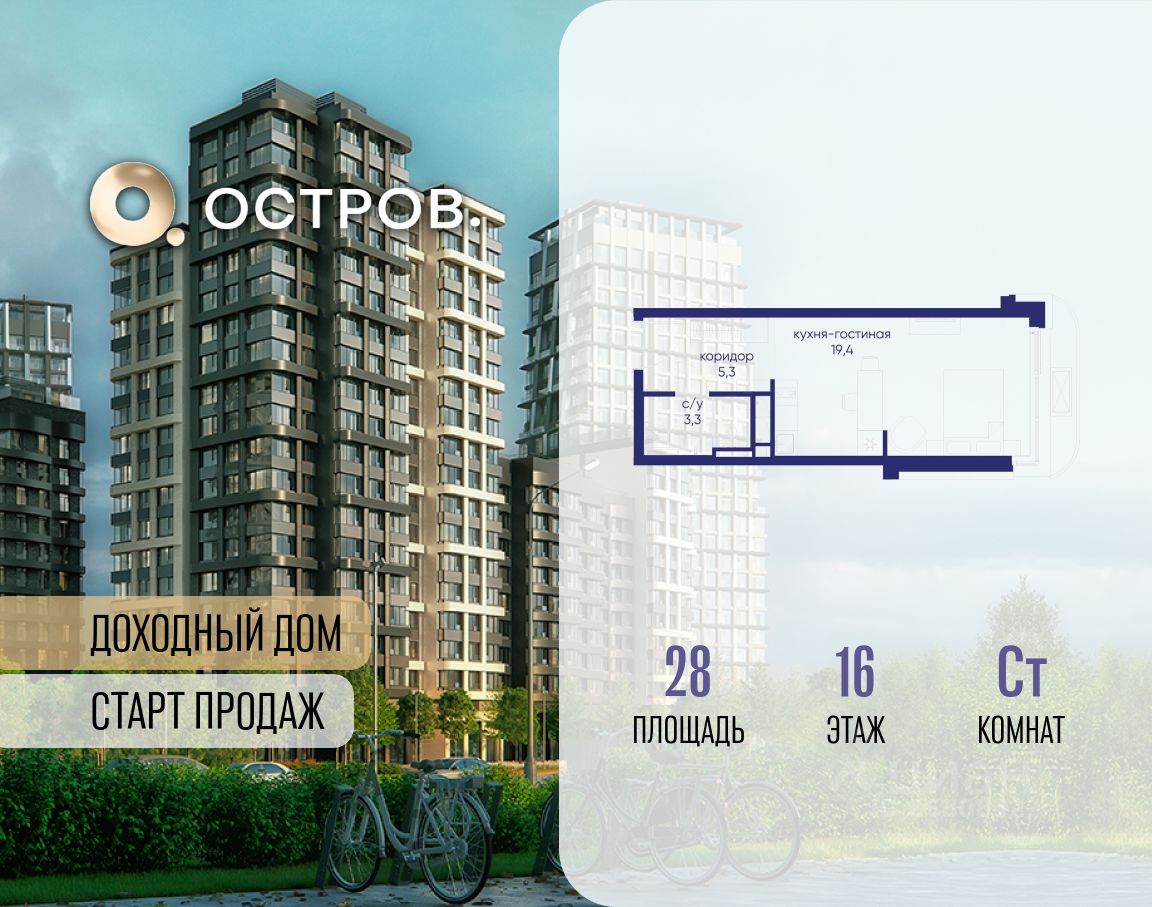 Продаётся квартира от застройщика: общая площадь 28.00 м², жилая 14.40 м², кухня 5.00 м², 16-й этаж, жилой квартал ''Остров 14'', корпус 1 (секция 2). Срок сдачи: 2 квартал 2029 года. 1 совмещенный санузел.