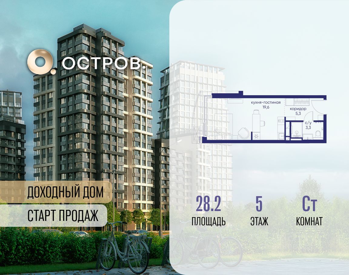 Продаётся квартира от застройщика: общая площадь 28.20 м², жилая 14.60 м², кухня 5.00 м², 5-й этаж, жилой квартал ''Остров 14'', корпус 1 (секция 1). Срок сдачи: 2 квартал 2029 года. 1 совмещенный санузел.