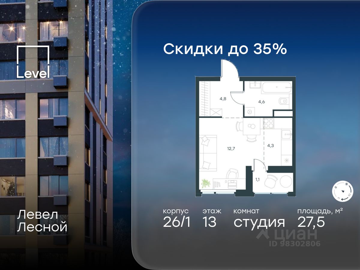 В районе, утопающем в густой зелени лесов, многочисленных парков и скверов, продаётся студия площадью 27.50 кв.м с отделкой white box. Квартира расположена на 13 этаже в жилом комплексе комфорт-класса Левел Лесной (компания Level Group/Левел групп).