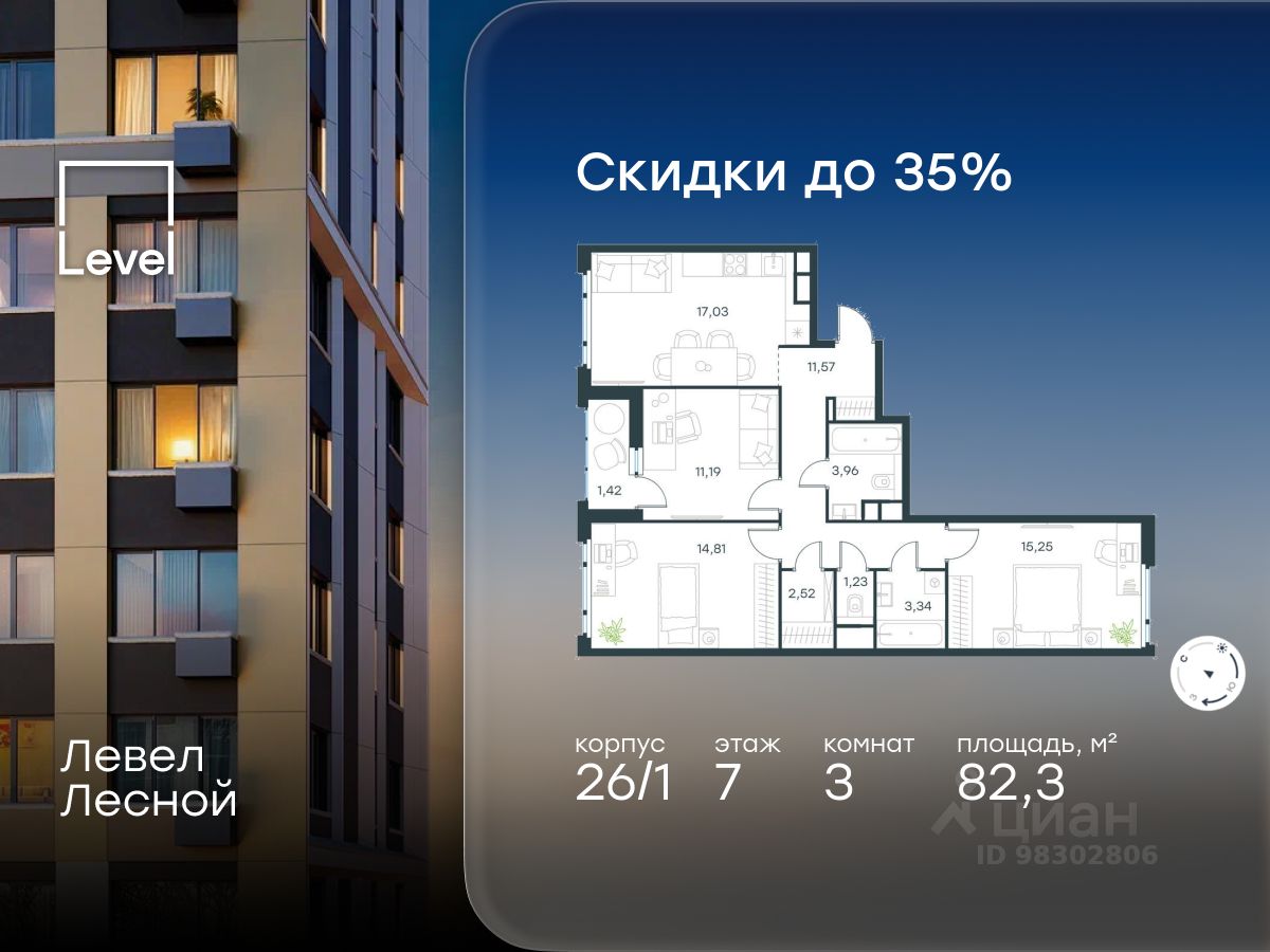 В районе, утопающем в густой зелени лесов, многочисленных парков и скверов, продаётся 3-комнатная квартира площадью 82.30 кв.м с отделкой white box. Квартира расположена на 7 этаже в жилом комплексе комфорт-класса Левел Лесной (компания Level Group/Левел групп).