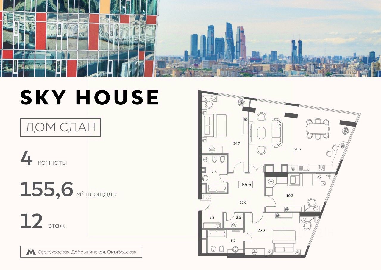 Продаётся 4-комнатная квартира площадью 155,60 кв.м. на 12 этаже в жилом комплексе SKY HOUSE.