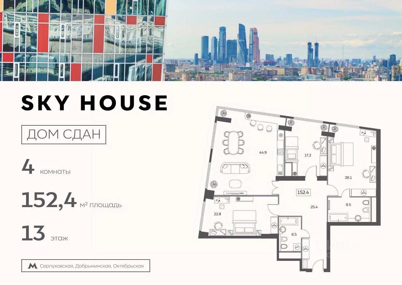 Продаётся 4-комнатная квартира площадью 152,40 кв.м. на 13 этаже в жилом комплексе SKY HOUSE.