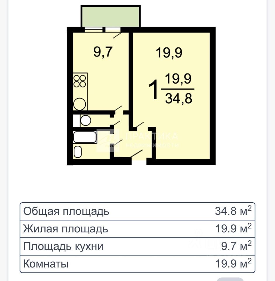 Квартира состоит из светлой комнаты, площадью 20м2 с нишей под спальное место и просторной кухни, площадью 10м2.