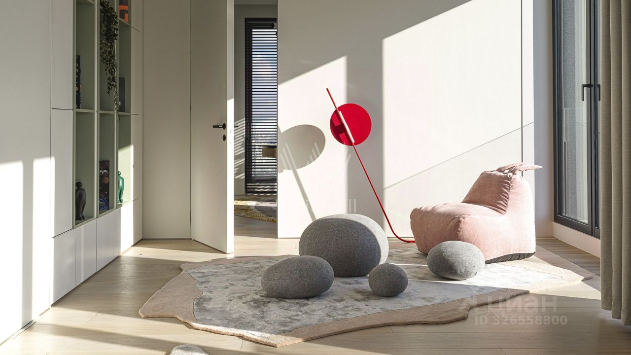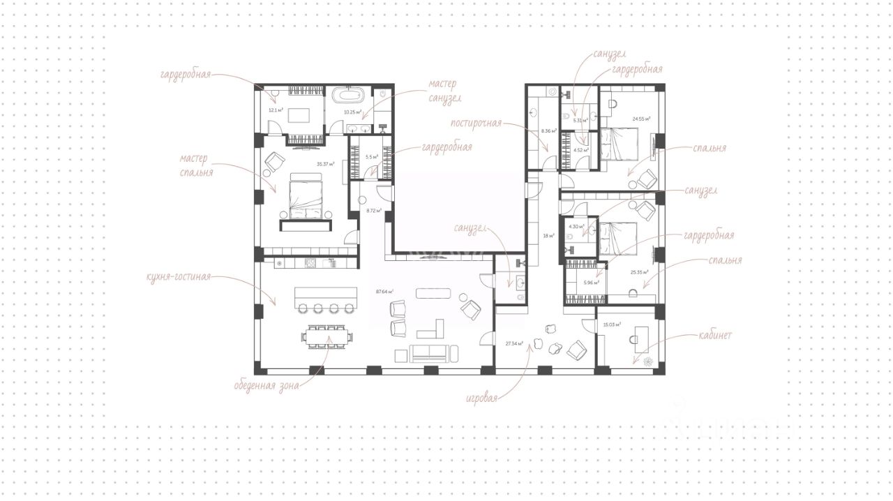 Просторная гостиная объединена с кухней-столовой и служит центральной частью квартиры, соединяя зоны отдыха и общения. Спланирована мастер-спальня со своей гардеробной комнатой с окном и ванной комнатой. В приватной зоне обустроены две спальни со своими ванными комнатами и гардеробными, кабинет и игровая. Холл с зонами хранения и постирочной.