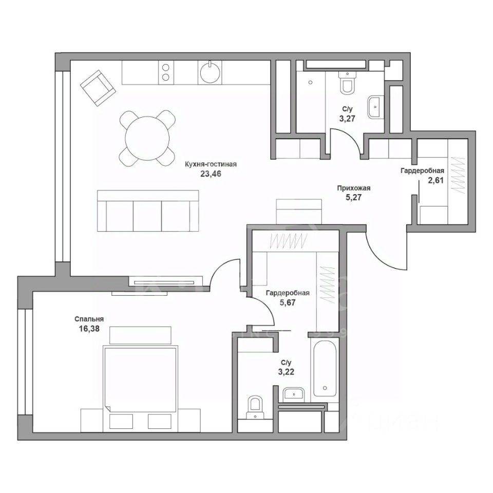 Планировочное решение: просторная кухня-гостиная, мастер-спальня со своей гардеробной комнатой и санузлом, вторая гардеробная комната, гостевой санузел.