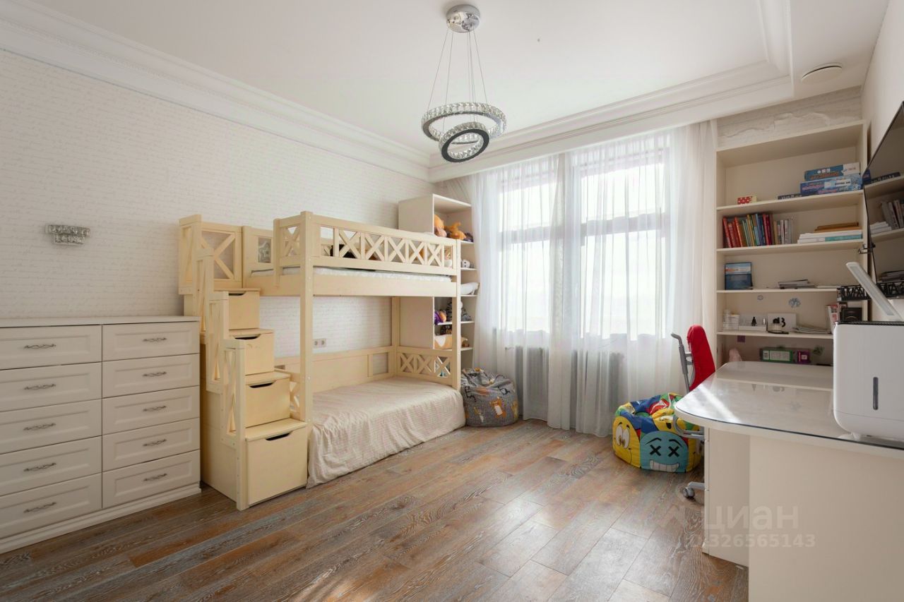 Мастер-спальня со своей гардеробной, санузлом и постирочной, а дополнительную шумоизоляцию добавляет теплая лоджия. Вторая спальня сейчас ориентирована на детей, здесь удобный гардеробный шкаф, двухуровневая кровать и много мест хранения. Обе спальни выходят на солнечную сторону.