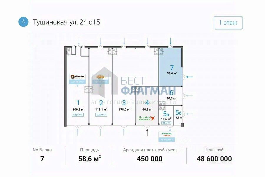 Арт. 123138068 Сдается торговая площадь, 58,6 м², в торговом центре ''на ул. Тушинская, 24с15'' Площадь: 58,6 м² Этаж: 1 из 1 Помещение: Свободно