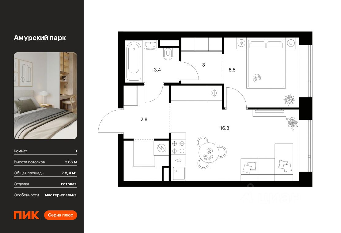 продам 1-к, Амурский парк ЖК, 4.517 975 040 ₽