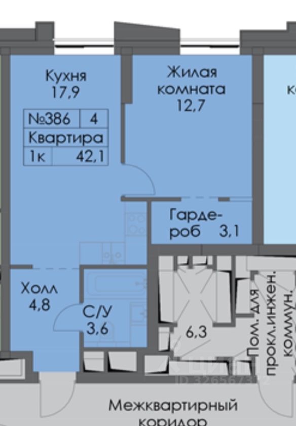 Квартира общей площадью 42,10 кв.м. Кухня-гостиная 17,9 кв.м., спальная комната 15,8 кв.м. с нишей под гардеробную, сан.узел совмещенный 3,6 кв.м. Окна выходят во двор.