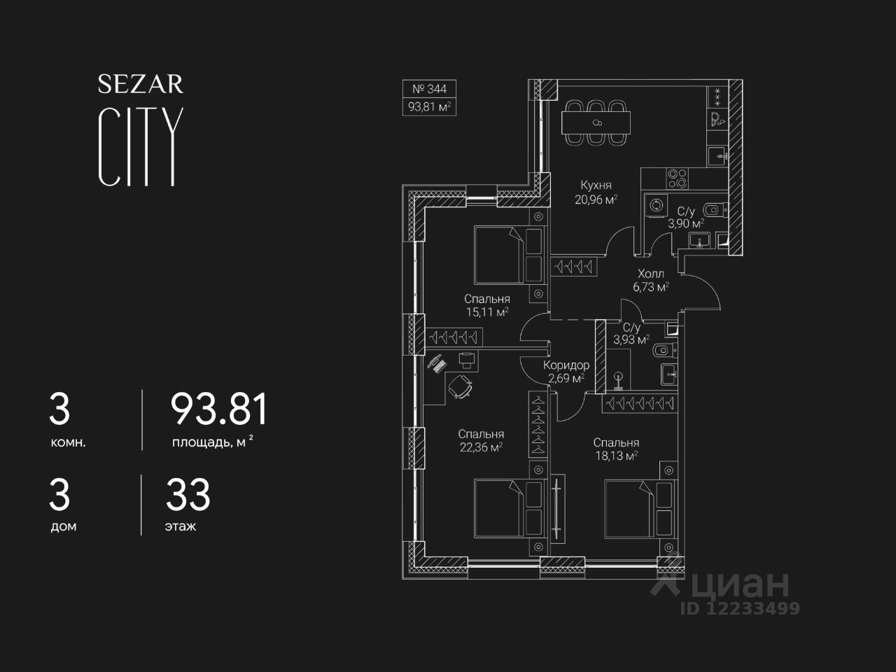 Продается 3-комнатная квартира в ЖК SEZAR CITY на 33 этаже. Общая площадь квартиры составляет 93,81 кв.м. Квартира без отделки. Срок сдачи - 2027 год.