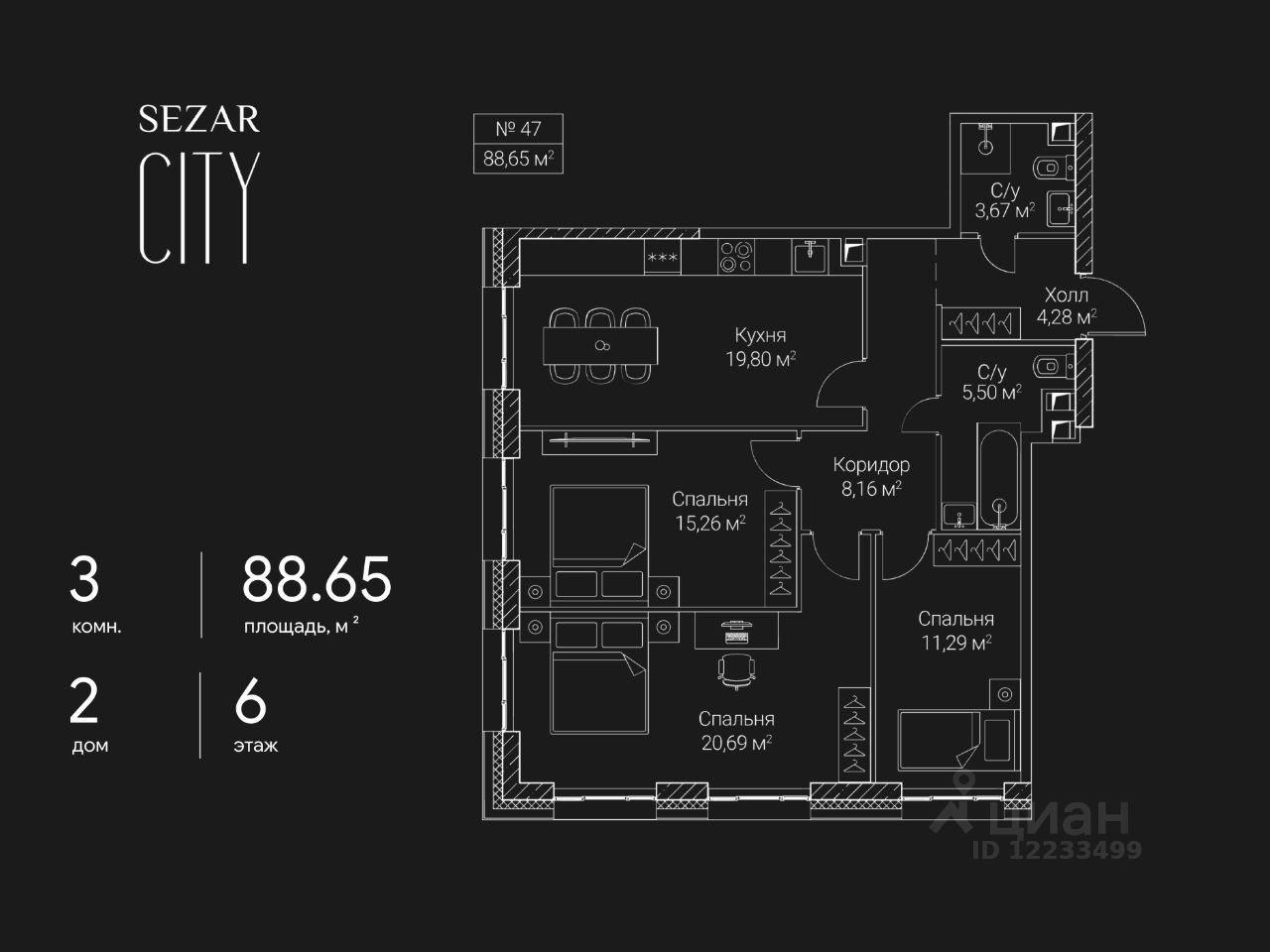 Продается 3-комнатная квартира в ЖК SEZAR CITY на 6 этаже. Общая площадь квартиры составляет 88,65 кв.м. Квартира без отделки. Срок сдачи - 2027 год.