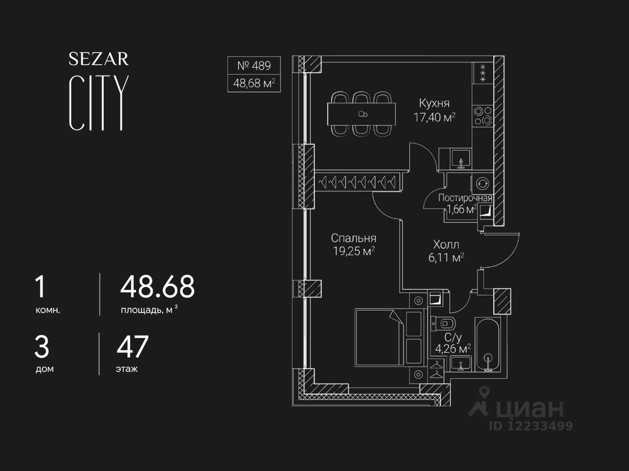Продается 1-комнатная квартира в ЖК SEZAR CITY на 47 этаже. Общая площадь квартиры составляет 48,68 кв.м. Квартира без отделки. Срок сдачи - 2027 год.
