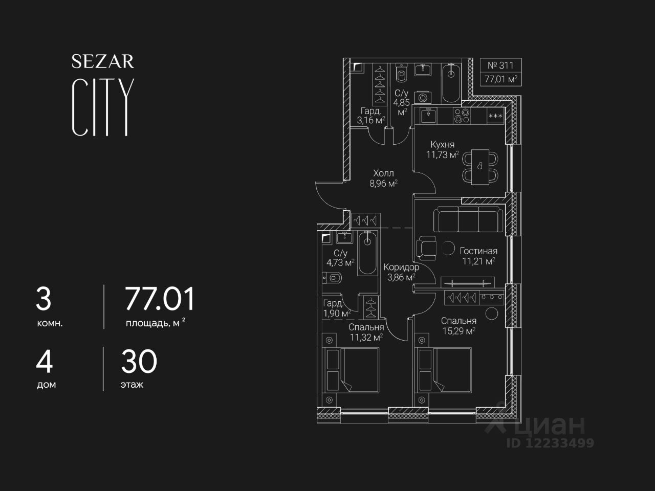 Продается 3-комнатная квартира в ЖК SEZAR CITY на 30 этаже. Общая площадь квартиры составляет 77,01 кв.м. Квартира без отделки. Срок сдачи - 2027 год.