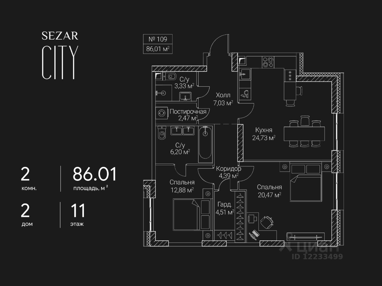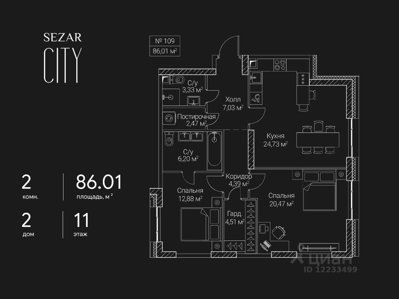 Продается 2-комнатная квартира в ЖК SEZAR CITY на 11 этаже. Общая площадь квартиры составляет 86,01 кв.м. Квартира без отделки. Срок сдачи - 2027 год.